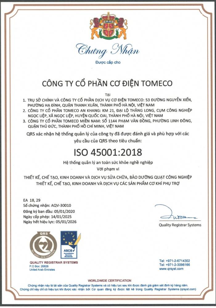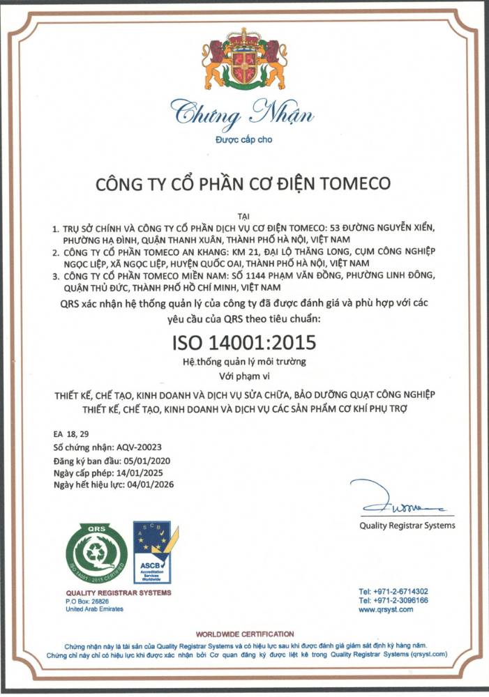 Trong suốt hành trình hơn ba thập kỷ, TOMECO luôn đặt chất lượng lên hàng đầu, không chỉ là một tiêu chí sản xuất mà còn là cam kết vững chắc đối với khách hàng. Việc cập nhật chứng nhận Tiêu chuẩn Cơ sở (TCCS) cho các model quạt mới nhất giúp đảm bảo: